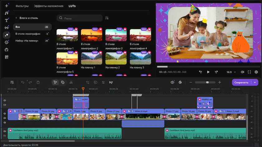 Обработайте изображения, добавьте музыку, синхронизируйте показ фотографий с длительностью аудиотреков.