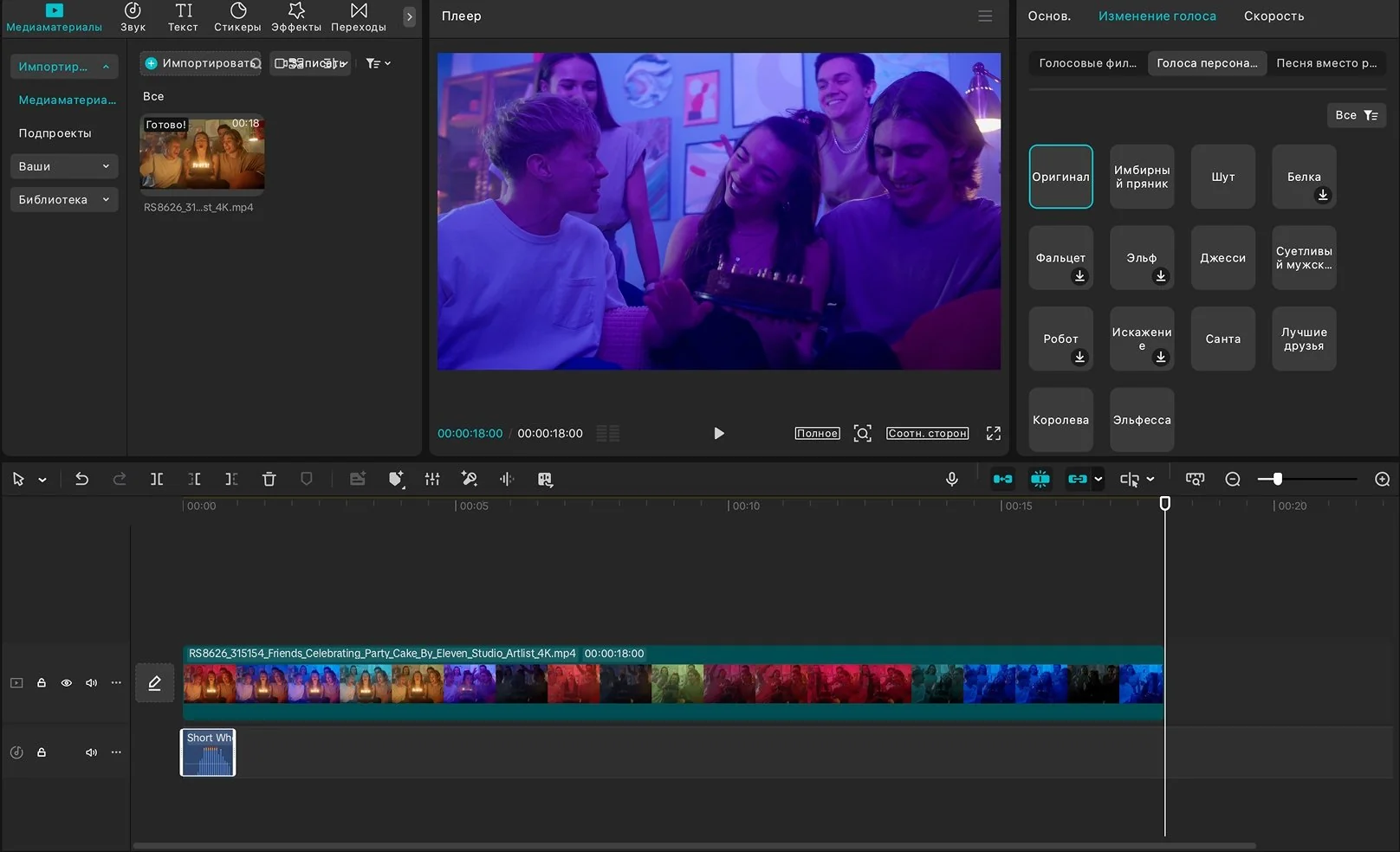 Если надо заменить в диалоге одного собеседника на другого, то качественнее всего получится сделать это через перезапись каждой реплики. В CapCut есть функционал для записи звука с подключенного или виртуального микрофона. С её помощью можно записать на отдельную дорожку новые реплики и удалить старые с основной дорожки, предварительно вырезав их через соответствующий инструмент на панели над таймлайном. Поменять голос без перезаписи в программе пока нельзя, такие функции в основном есть у нейросетевых инструментов, требующих железо гораздо мощнее, чем нужно для корректной работы Капката. Но изменить и сделать неузнаваемым голос в CapCut можно, например, повысить или понизить тональность, добавить эхо, шум и другие искажения. Для этого используйте функции на вкладке Изменение голоса, а также регуляторы вкладок Основное и Скорость.
