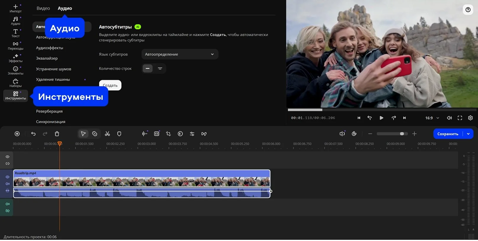 2. В основной панели меню выберите Инструменты и откройте вкладку Аудио.