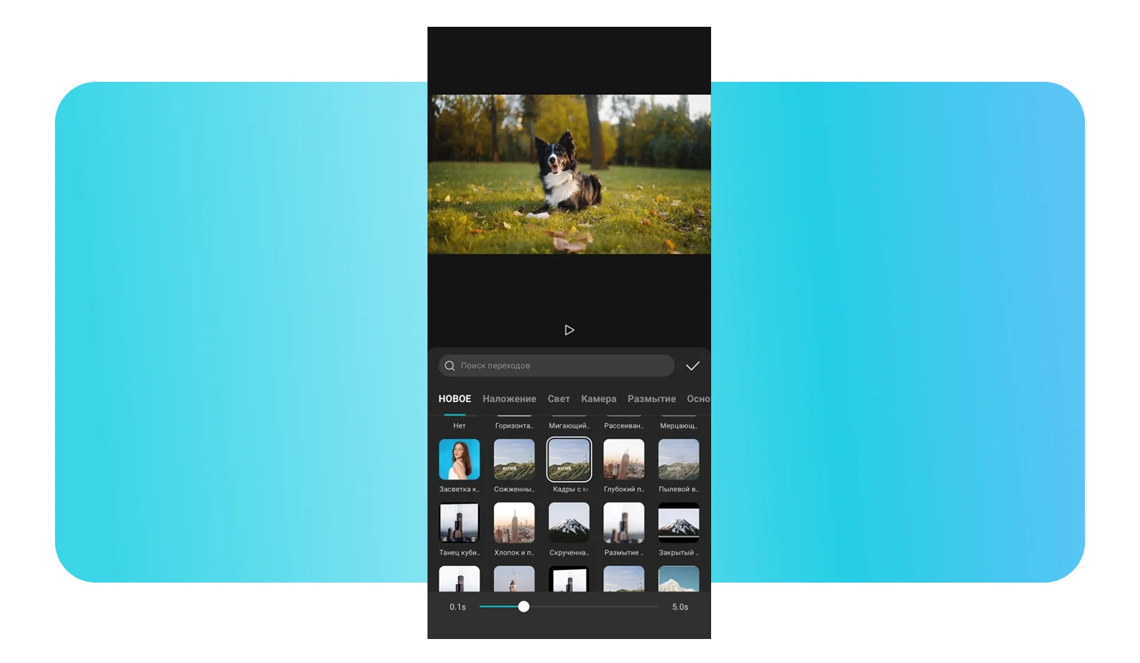 2. Выберите подходящий для реализации вашей идеи эффект. Трендовые в приложении всегда вынесены во вкладку Новые, остальные для удобства разделены по категориям. При нажатии на пресет в основном окне предварительного просмотра проигрывается результат добавления перехода.