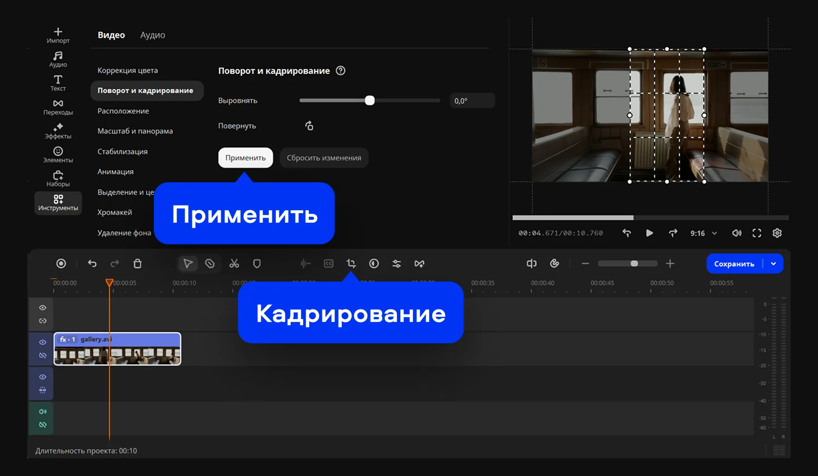 5. Не нравятся поля? Не проблема. Кликните по клипу на таймлайне, чтобы он выделился светлой рамкой. Теперь на панели инструментов над ним найдите иконку Кадрирование. Откроется новое окно. Здесь вы можете двигать и масштабировать рамку, чтобы выбрать, какая часть кадра останется в видео. Нажмите Применить, и поля исчезнут.