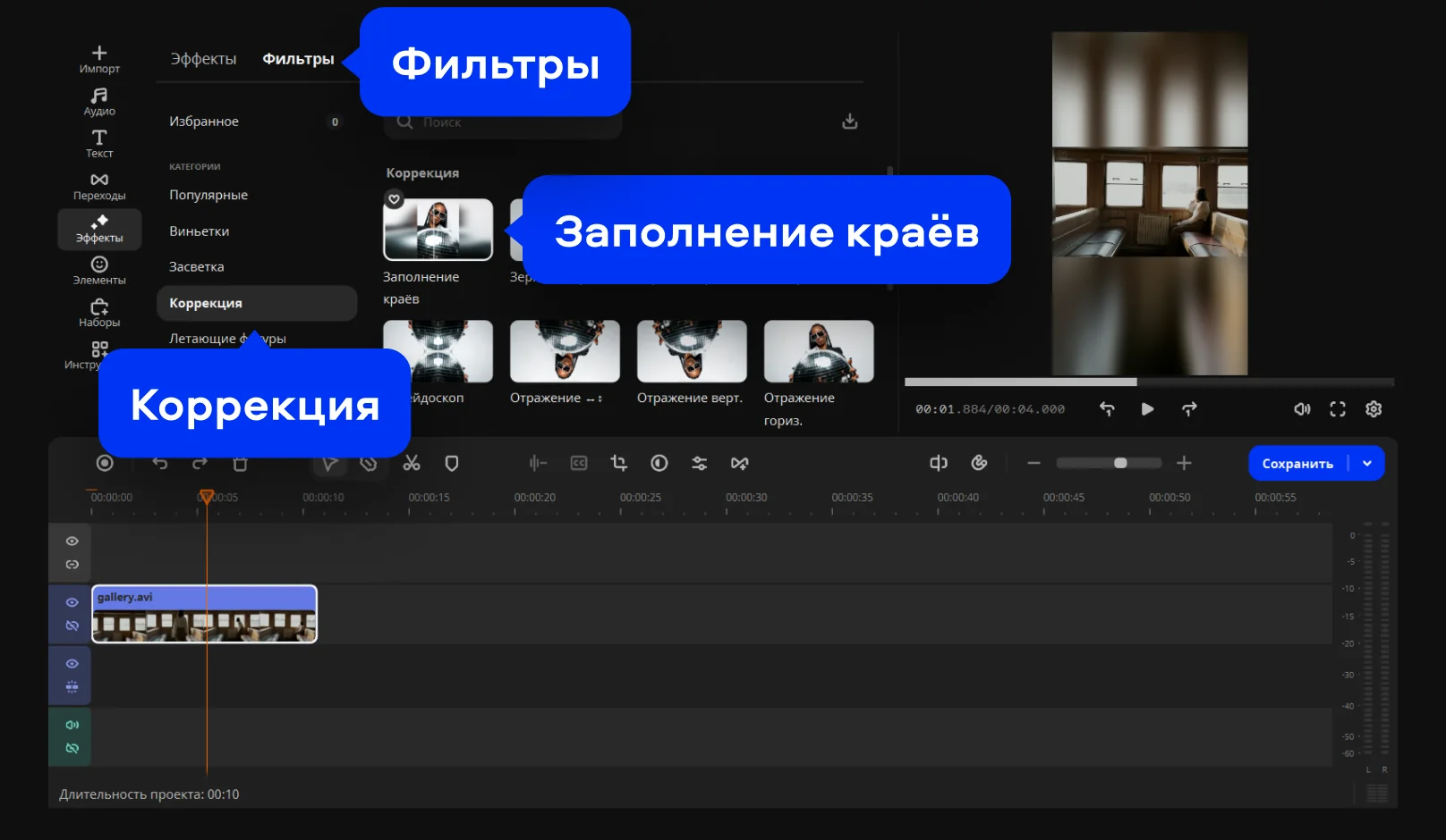 6. Другой вариант – заполнить поля размытым изображением кадра. Выделите клип на таймлайне, откройте вкладку Фильтры и выберите фильтр Коррекция → Заполнение краев.