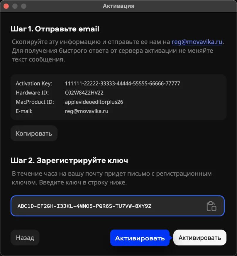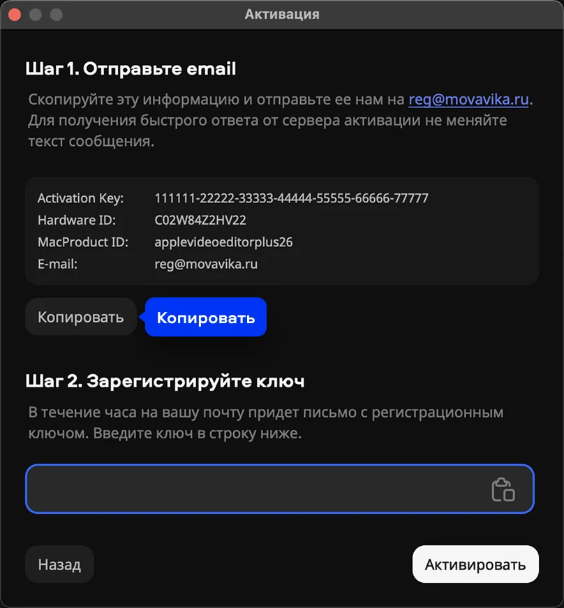 Скопируйте регистрационный ключ из письма и вставьте его в соответствующее поле диалога активации. Нажмите Активировать.
