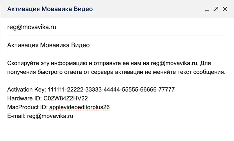 Большинство программ Мовавика имеют две версии: для Windows и macOS. Проверьте, что в письме правильно указана операционная система вашего компьютера. В противном случае обратитесь в службу техподдержки. - При офлайн-активации убедитесь, что вы вставили ключ активации и регистрационный ключ в правильные поля.
