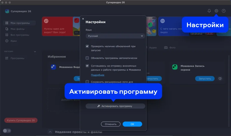 Запустите программу Мовавика Супервидео. Кликните по иконке шестеренки в правом верхнем углу программы. Нажмите кнопку Активировать программу внизу диалогового окна.