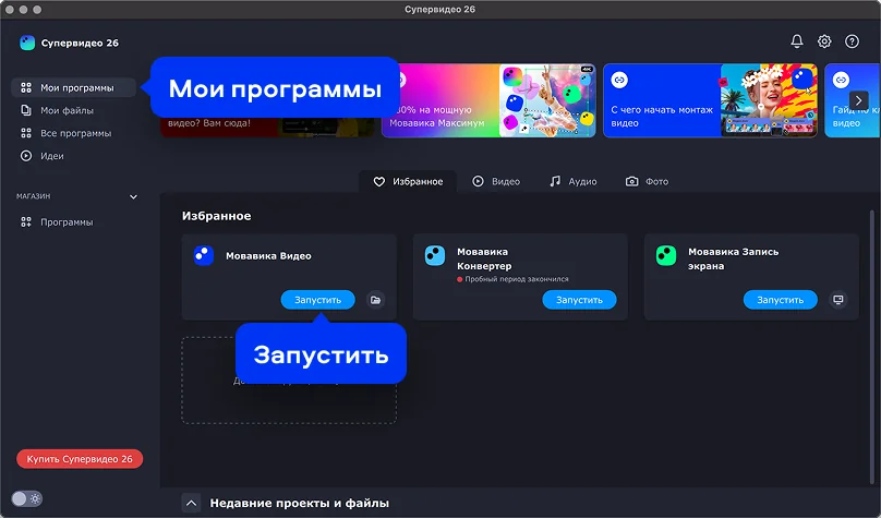 Откройте программу, в которой вы хотите использовать эффекты. Если у вас Мовавика Супервидео, перейдите в раздел Программы и запустите Видео или Слайд-шоу.