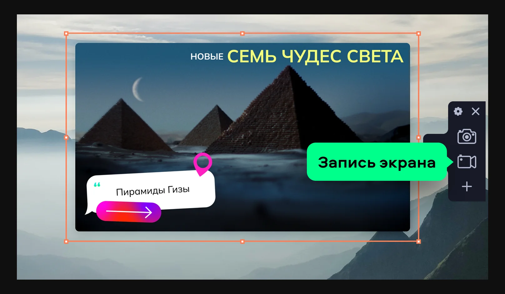 На боковой панели нажмите на Запись экрана. С помощью мышки наложите рамку захвата видео на ту часть экрана, которую хотите записать.