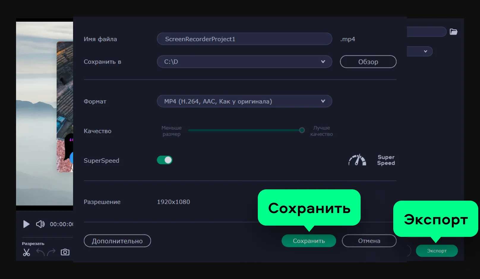 Если хотите поменять формат, нажмите на кнопку Экспорт, выберите формат, а затем нажмите Сохранить – запись у вас на компьютере!