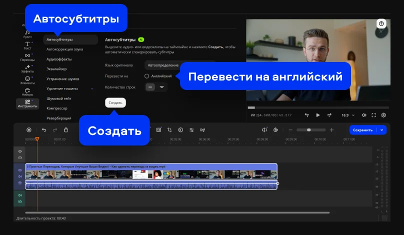 В разделе Автосубтитры нажмите на кнопку Создать. Искусственный интеллект быстро сгенерирует субтитры к вашему видео. При необходимости вы можете перевести субтитры на английский язык.