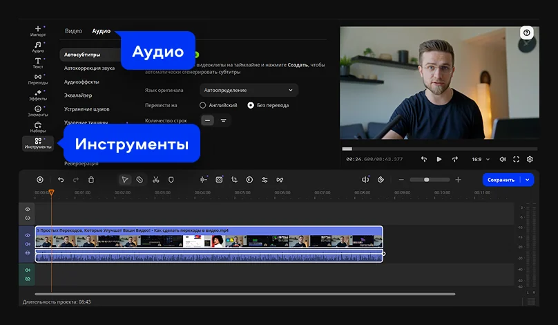 Кликните на видео и перейдите в Инструменты, а затем откройте вкладку Аудио.