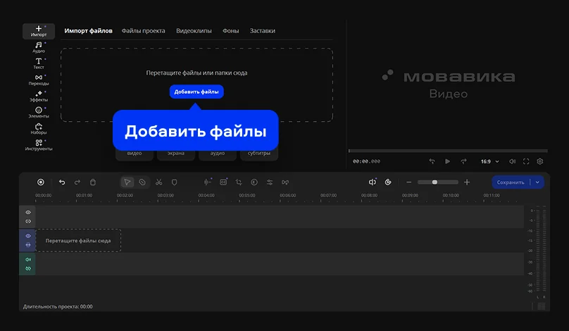 Нажмите Добавить файлы и выберите видео, которое хотите загрузить. Когда видео будет добавлено в программу, переместите его на шкалу времени.