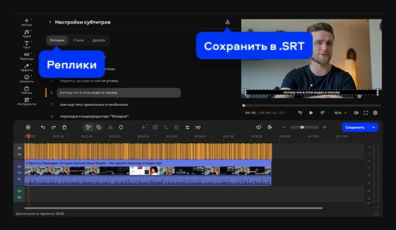 На вкладке Реплики вы сможете отредактировать текст субтитров при необходимости. Вы также можете сохранить субтитры в формате SRT, нажав кнопку Сохранить в .SRT.