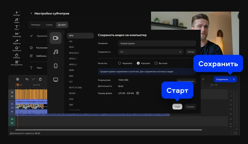 Хотите добавить автоматические субтитры в свое видео? Попробуйте Мовавика Видео! Искусственный интеллект быстро разберет вашу речь и автоматически создаст субтитры. Вам останется только самое приятное: выбрать шрифт, цвет текста и расположение.