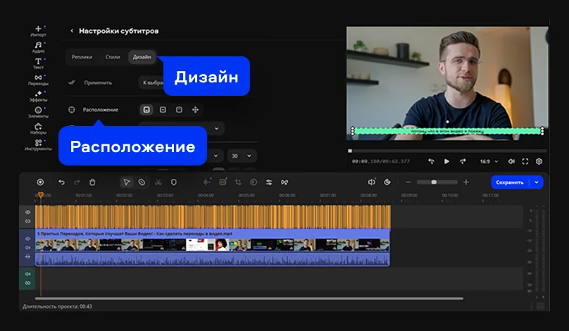 На вкладке Дизайн вы найдете все нужные инструменты, чтобы изменить внешний вид субтитров. Используйте подходящие опции в разделе Расположение, чтобы изменить положение субтитров на видео.