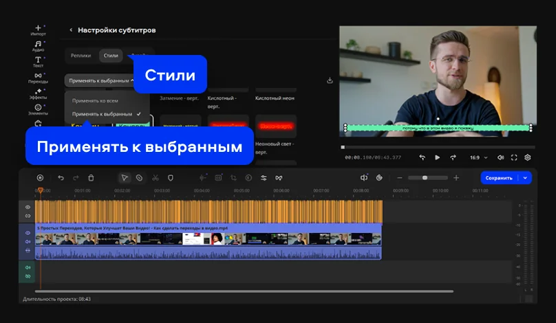 На вкладке Стили можно выбрать дизайн для субтитров. В программе доступно более 30 стилей, которые идеально подходят для любого типа видео. Выбранный стиль будет по умолчанию применен ко всем клипам в проекте. Если вы хотите использовать разные стили, выделите клип на временной шкале и выберите Применять к выбранным.