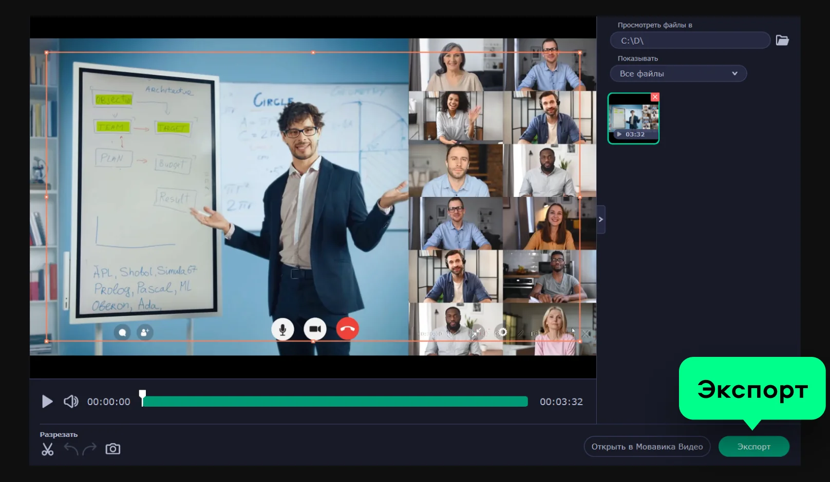 Если всё готово, нажмите на кнопку Экспорт, выберите формат, а затем нажмите Сохранить – запись у вас на компьютере!