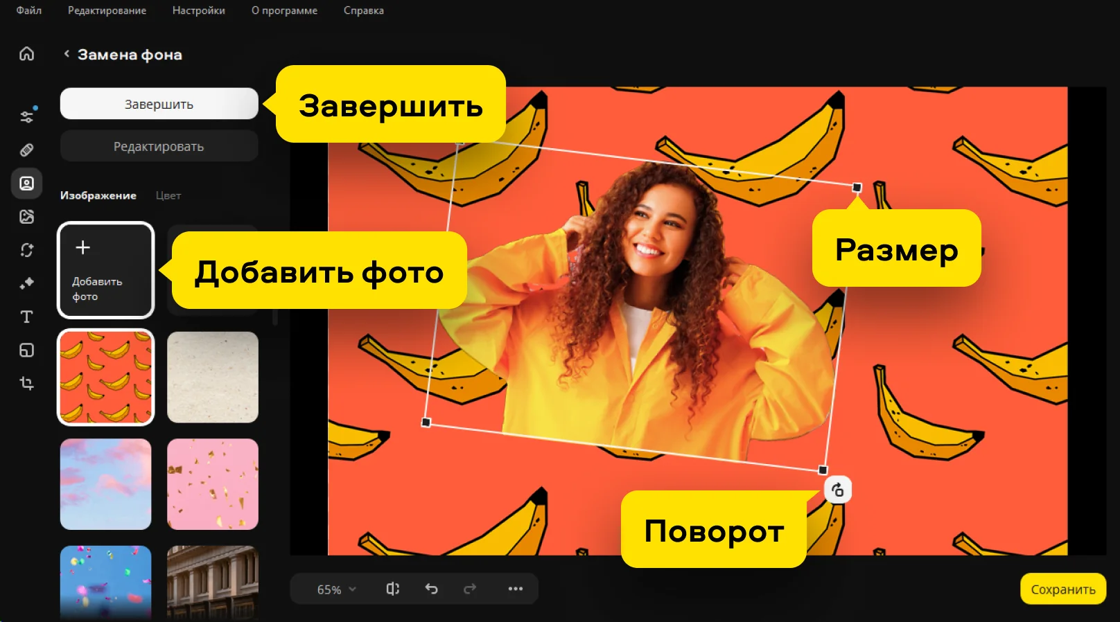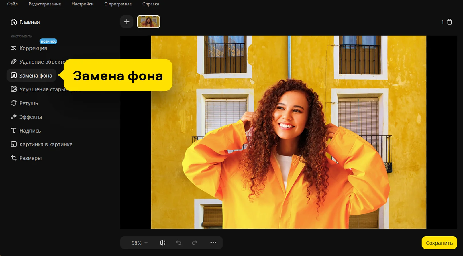 Нажмите на опцию Замена фона, чтобы открыть инструмент для полного удаления заднего плана картинки или замены его на другой.