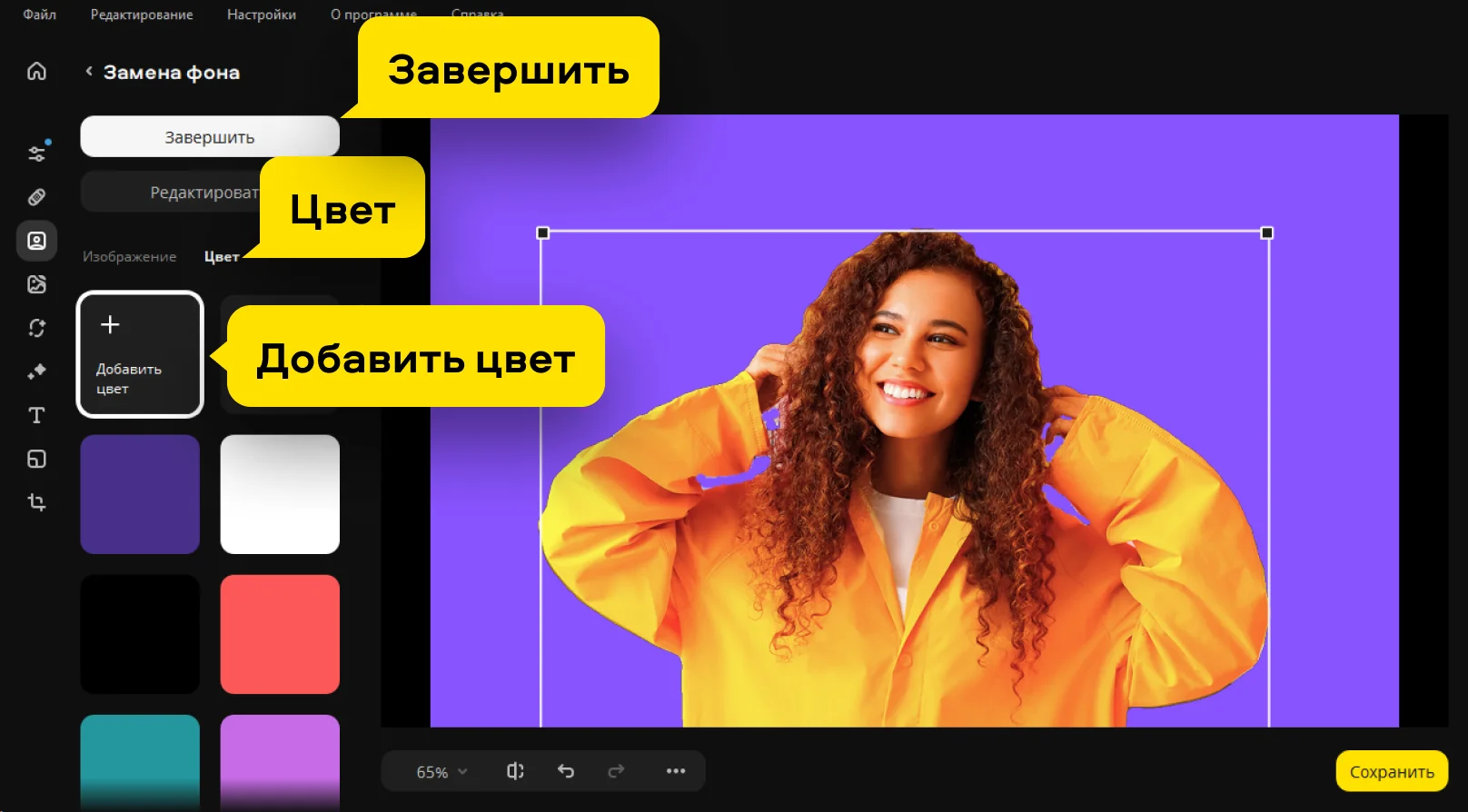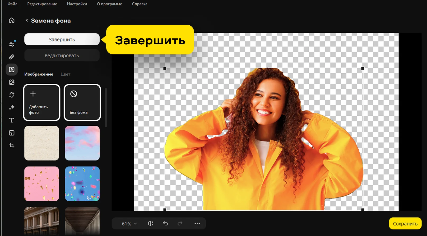 Задний план вашего фото заменён на шахматку – значит, фон удалён, он стал прозрачным. Нажмите Завершить, чтобы получить изображение в этом варианте.