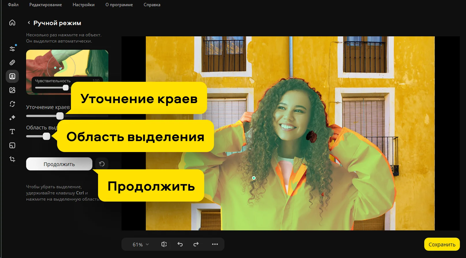 Выберите диаметр кисти ползунком Область выделения, затем кликните несколько раз на объект, чтобы выделить его. С помощью инструмента Уточнение краёв подправьте выделение: нажимайте на незакрашенные части до тех пор, пока весь объект не станет зелёным.
