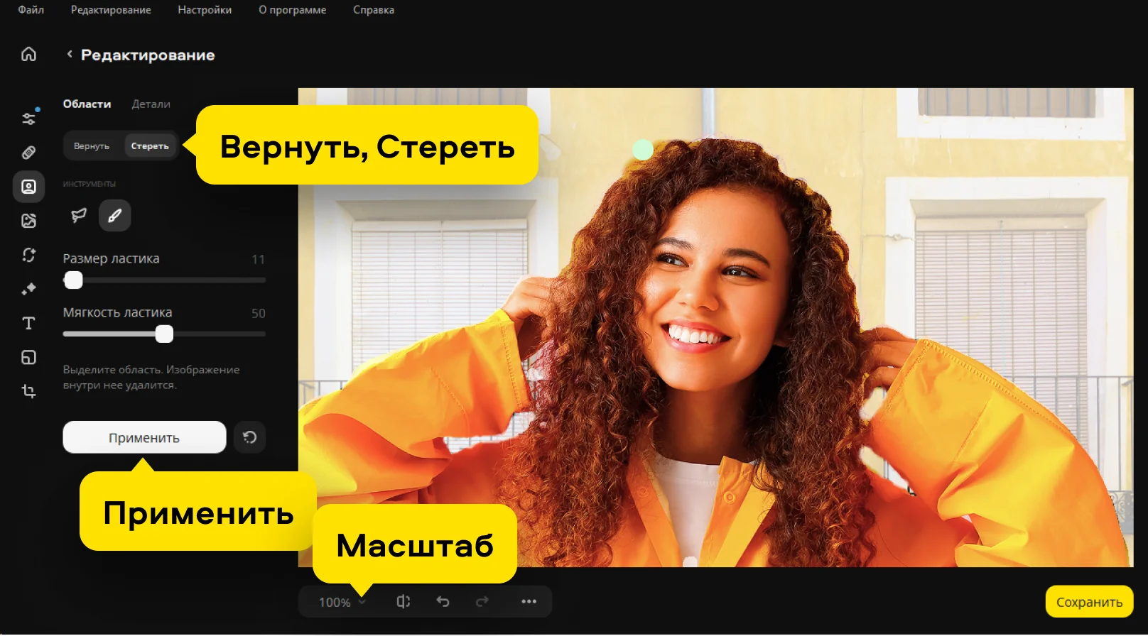Чтобы восстановить ошибочно удалённую часть объекта, нажмите Вернуть и выделите нужную область.