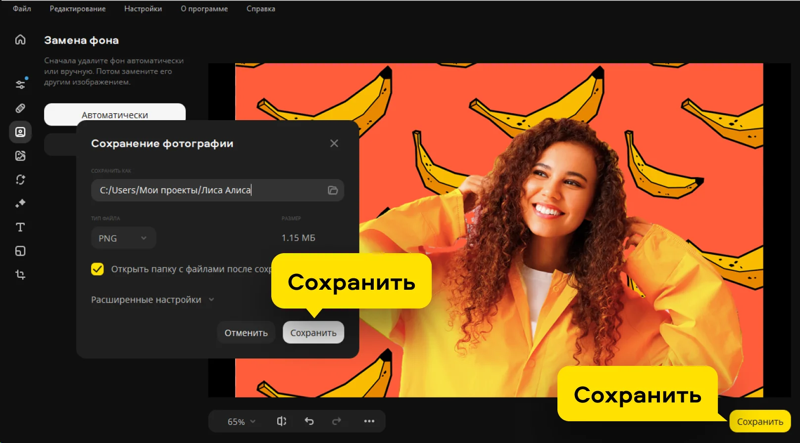 Чтобы сохранить полученную картинку, нажмите Сохранить в правом нижнем углу программы.