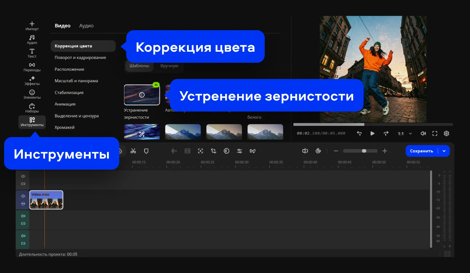 Нажмите на вкладку Инструменты и перейдите в раздел Видео. Перенесите Устранение зернистости из меню Коррекция цвета на свой клип на Таймлайне. Нейросети моментально очиститят кадр от шума и сделают ваше видео более четким.