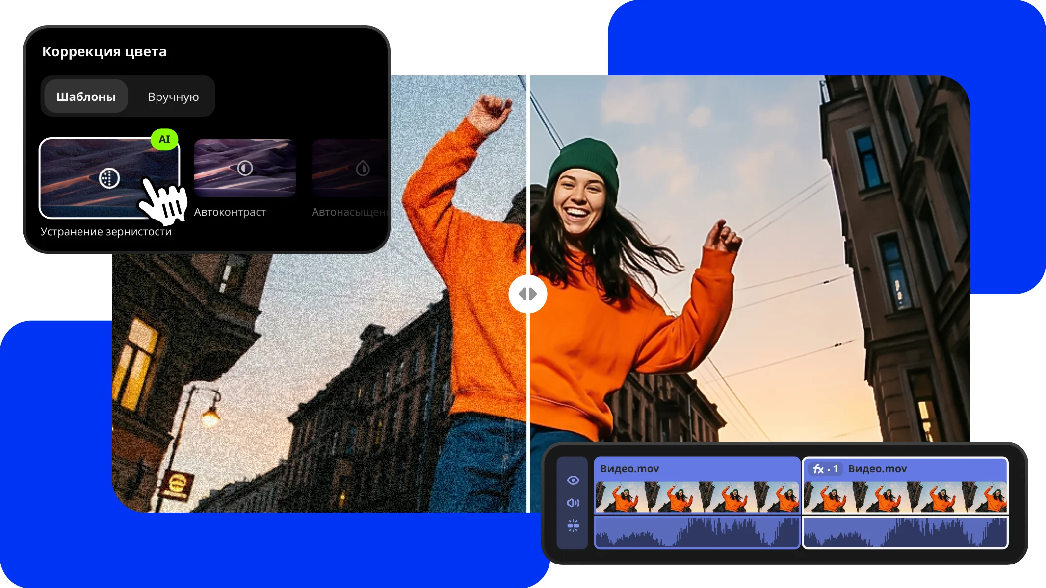 Избавьтесь от визуального шума за пару кликов – программа сгладит рябь, а лица и мелкие детали останутся чёткими. Очень полезно, если снимали на телефон при слабом освещении или нужно улучшить старые зернистые видео. Чтобы попробовать, перейдите в Коррекцию цвета и перетащите Устранение зернистости на клип – все шероховатости сглажены, а ваше видео готово сиять!