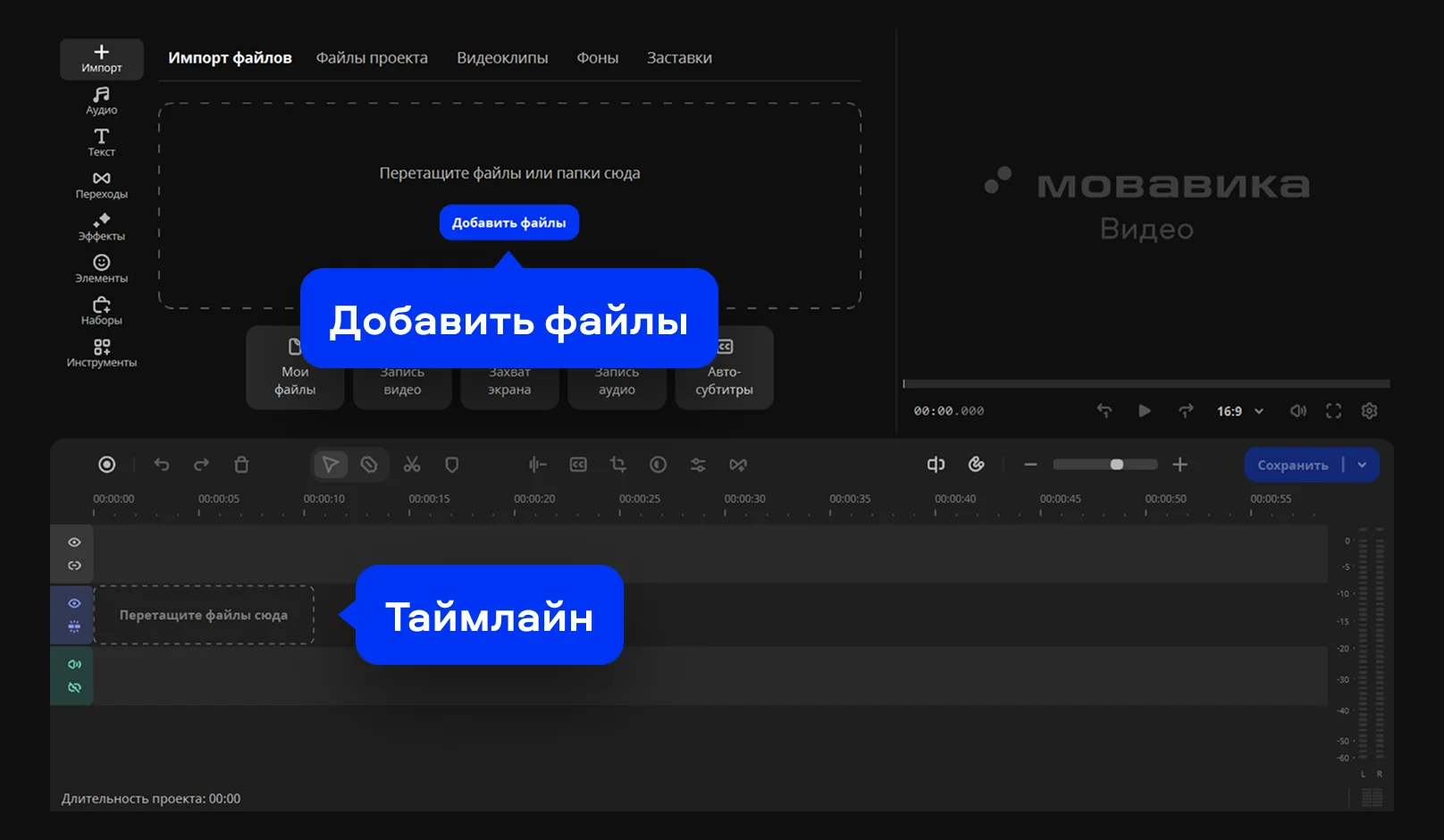 Нажмите Добавить файлы, выберите нужное видео и перенесите его на Таймлайн.