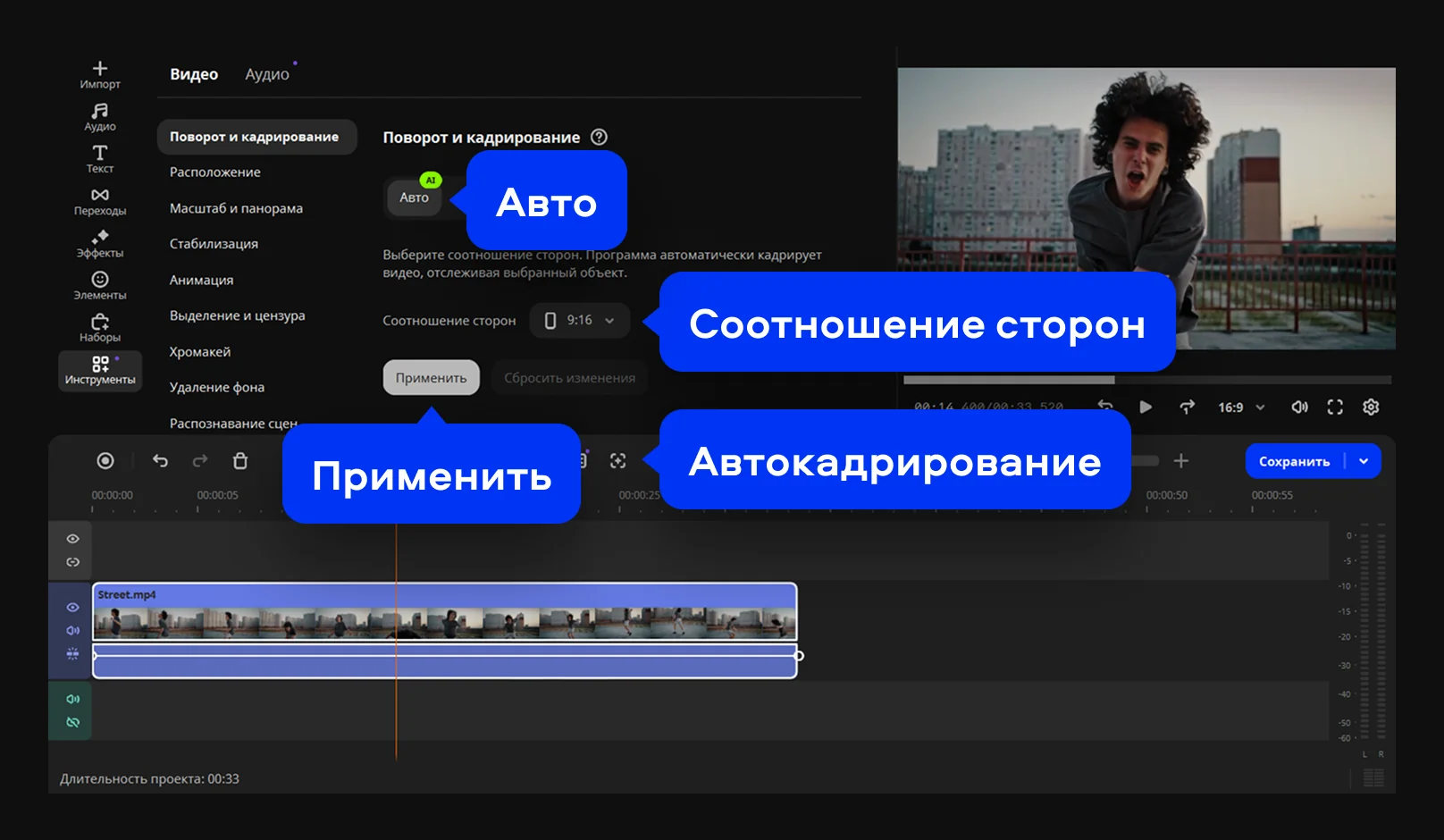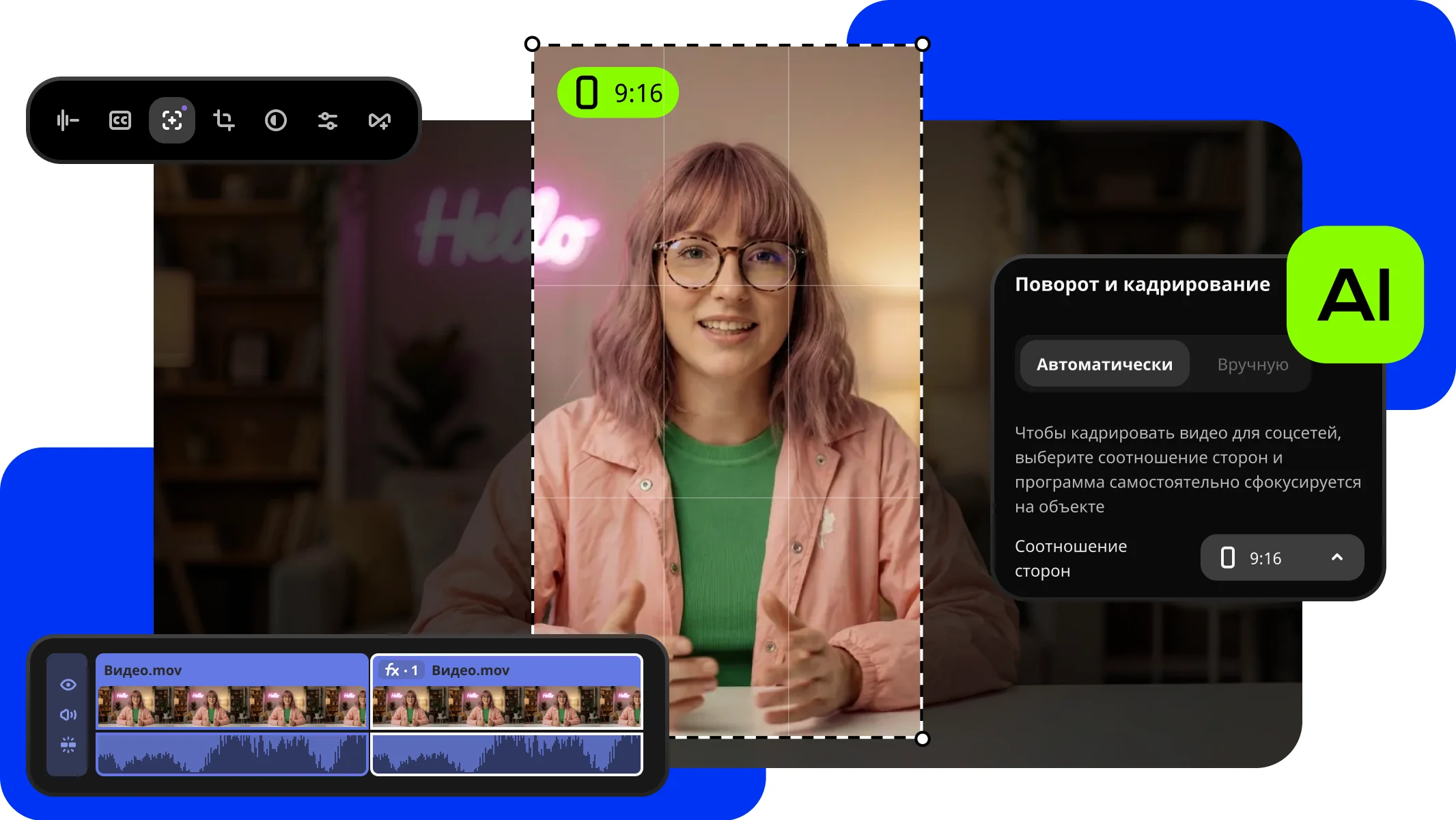 Обрезайте видео так, чтобы главный объект автоматически оставался в кадре. Программа сама отследит человека или предмет на видео и удержит его по центру – идеально, чтобы перевести горизонтальное видео в вертикальный формат для соцсетей.