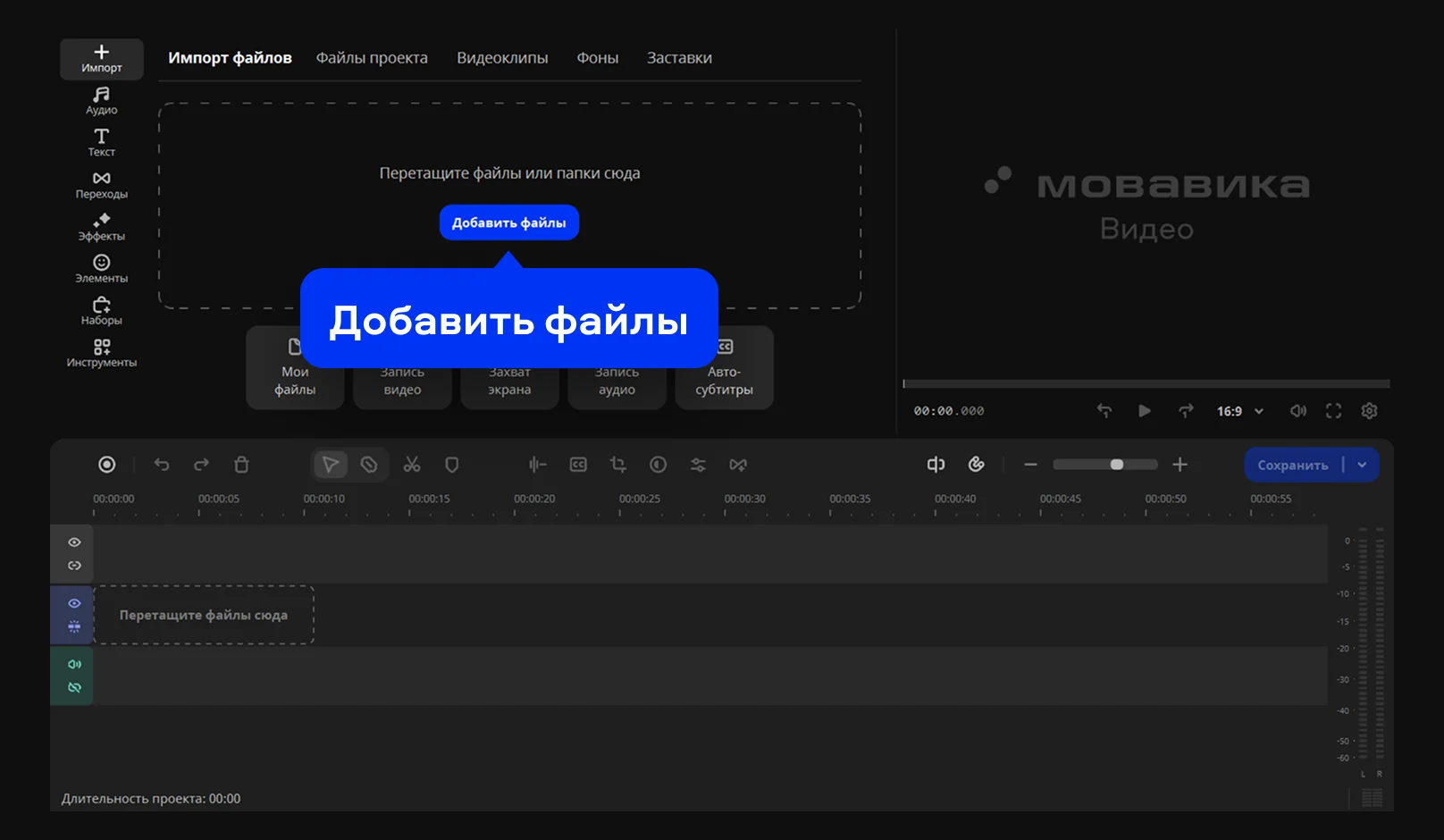 Нажмите Добавить файлы, выберите нужное видео и перенесите его на Таймлайн.