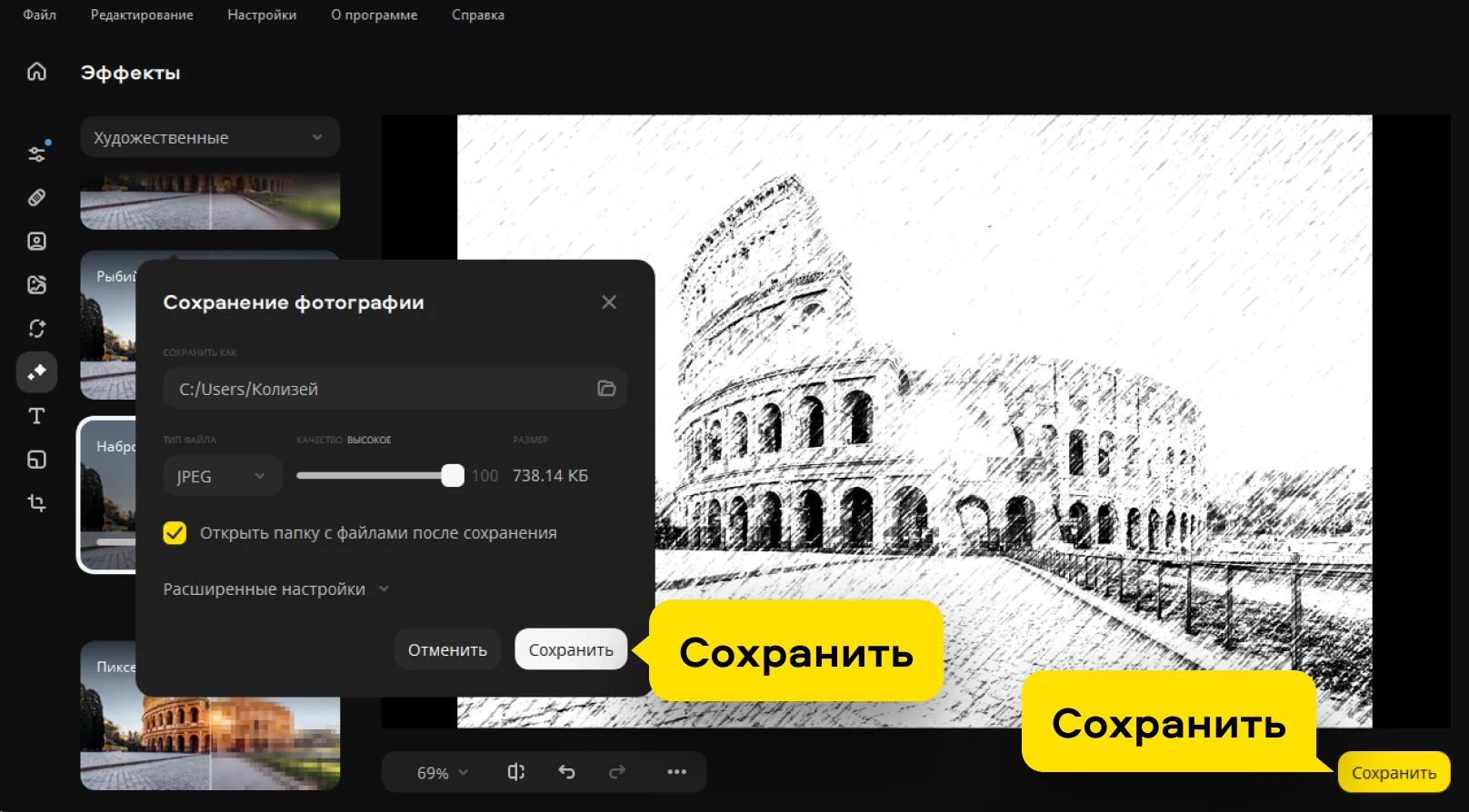 Когда всё готово, нажмите Сохранить в правом нижнем углу программы. В открывшемся окне внесите имя файла, выберите папку сохранения и формат. Ещё раз нажмите Сохранить.