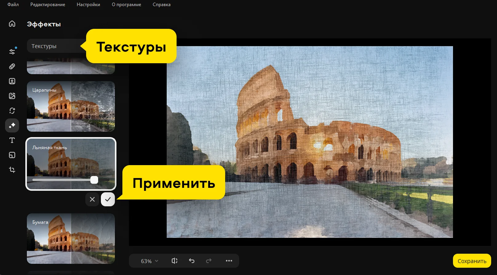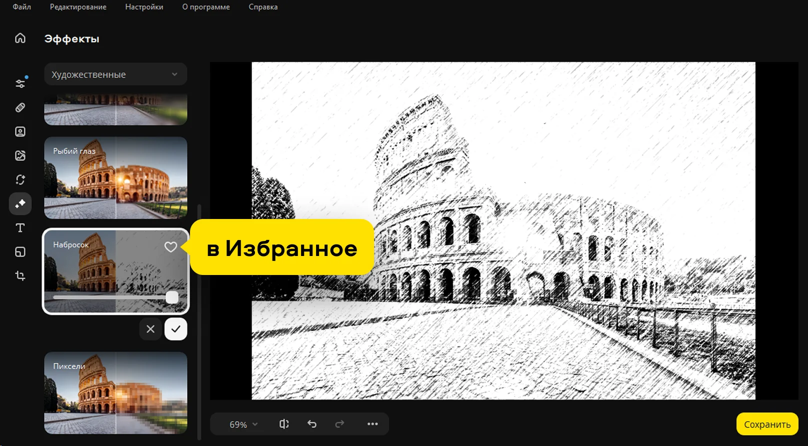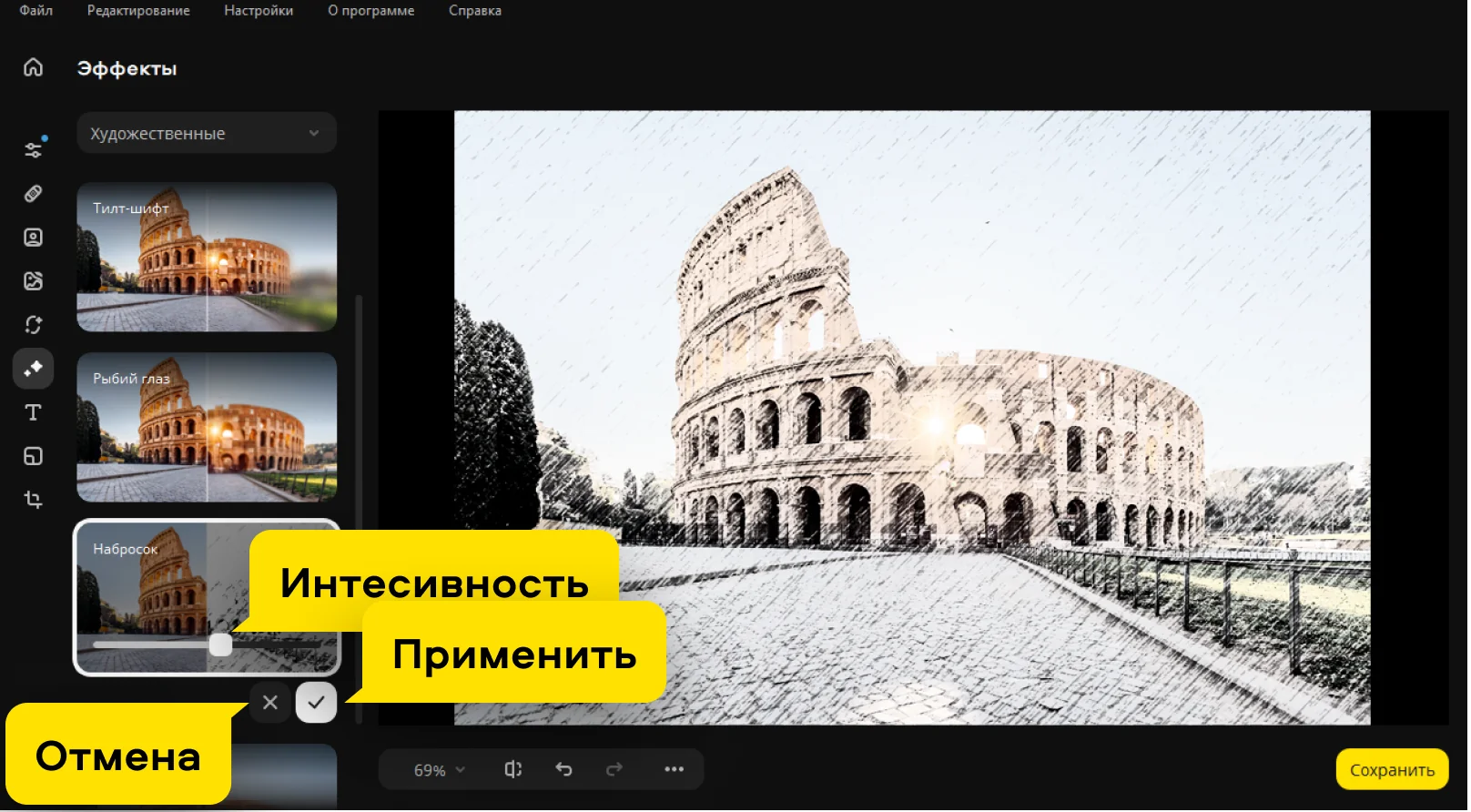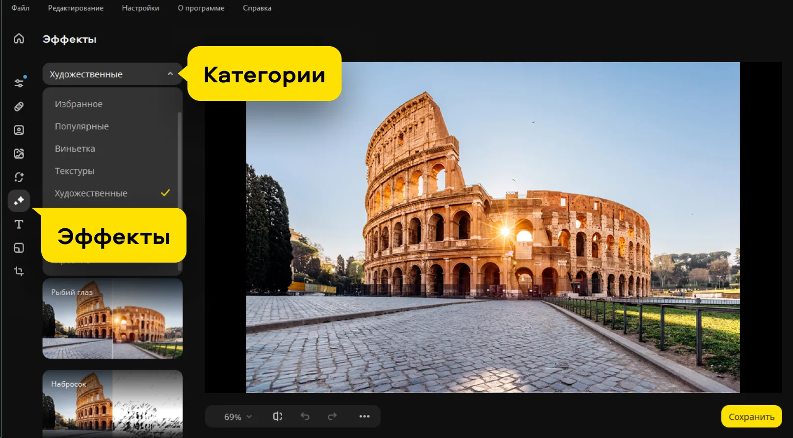 Огромная коллекция эффектов поможет вам подчеркнуть атмосферу на любом фото. Выбирайте из сотни опций, удобно разделённых на категории: «Креатив», «Винтаж», «Текстуры», «Художественные» и другие. Вы можете легко превратить фото в картину маслом или карандашный набросок, добавить солнечные блики или сделать изображение в стиле ретро. Добавляйте нужный эффект одним движением мыши, регулируйте интенсивность и делитесь результатом с друзьями.