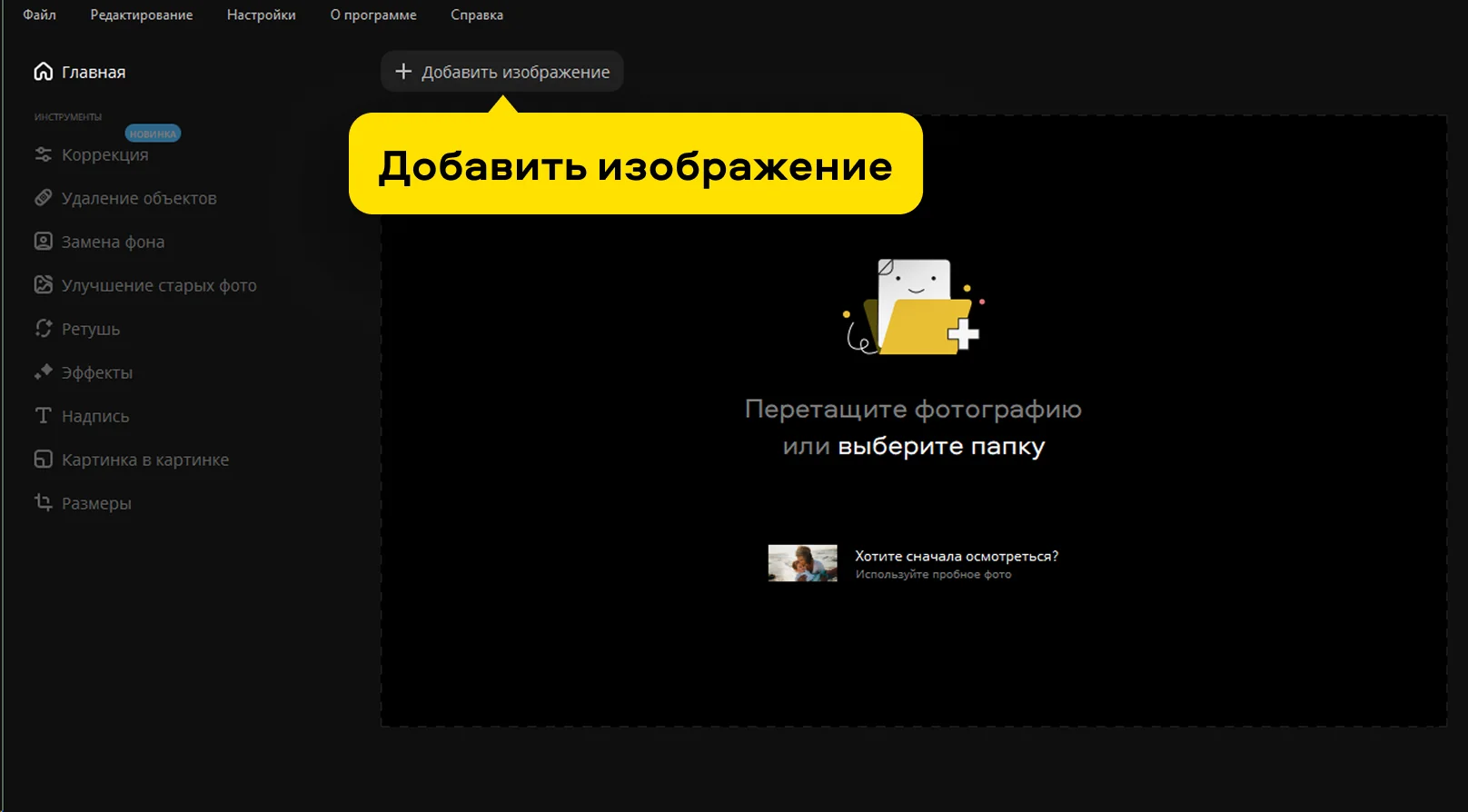 Чтобы загрузить фото, нажмите Добавить изображение или просто перетащите файл в окно программы.